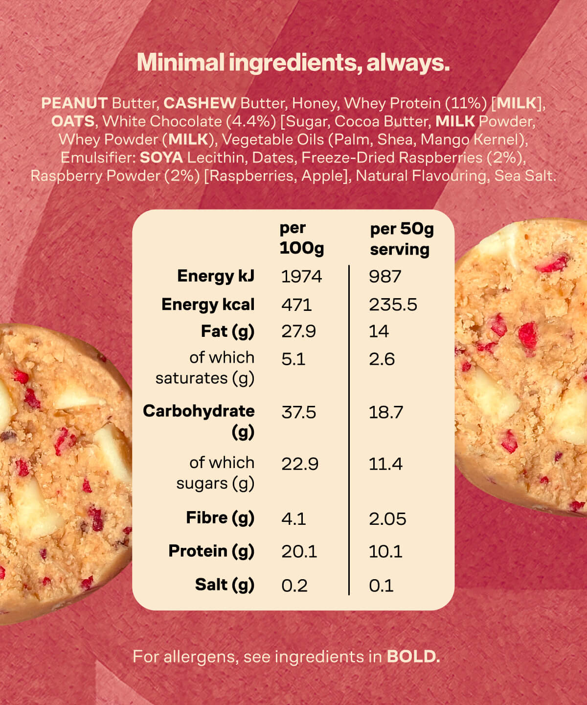 creamy cashew butter base, with smooth white chocolate and a bright raspberry bite